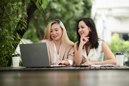 Businesswoman showing business plan on laptop screen to colleague at meeting