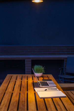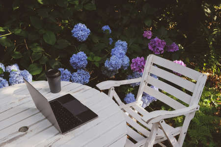 Outdoor remote workspace with laptop on garden table and nature view in the background