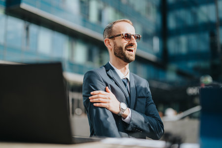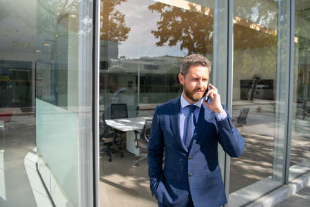 Positive businessman in suit formal wear reading good finance news using mobile wireless internet connection near office building.