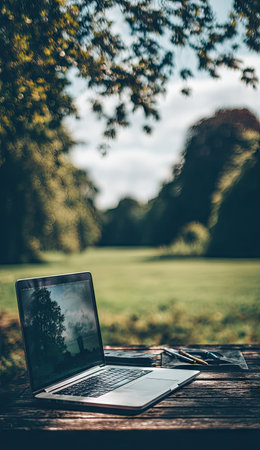 A laptop computer sits open on a weathered wooden table in an outdoor setting. The background showcases blurred trees and a grassy field. The scene features natural lighting and a shallow depth of field, emphasizing the laptop. Suitable for digital marketing, website design, and lifestyle content.