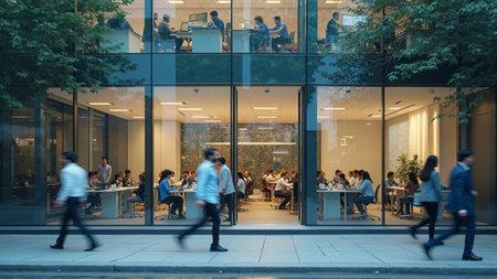 A large glass office building with people visible inside working in a modern environment. The street view shows movement with pedestrians and a busy urban setting.