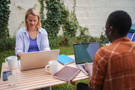 Mature multiracial businesswomen using cellphone while working in park outdoors