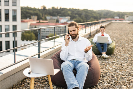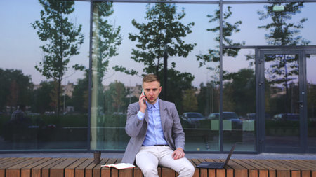 Young successful smiling smart man businessman or student in casual blue shirt, glasses sitting at table, talking on mobile phone in city park using laptop, working outdoors. Mobile Office concept