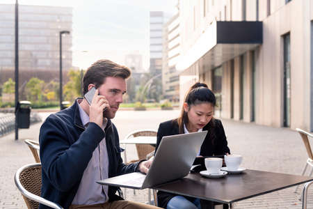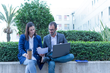 Business people. Beautiful Caucasian businesswoman and Caucasian businessman with a laptop sitting working outside an office building.