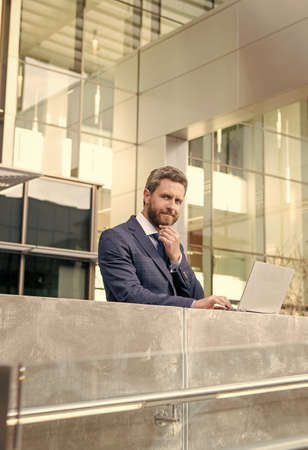 Pensive man manager thinking about new financial project, sitting with portable laptop computer in business center. Thoughtful male leadership using netbook while waiting conference in enterprise