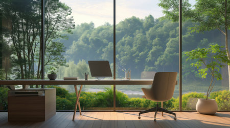 Well-lit home office space with a modern desk, a laptop, and a panoramic view of a lush forest
