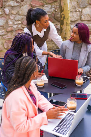 Young businesswomen of black ethnicity. At a business meeting in a cafeteria. Team work