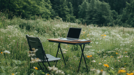 An inviting workspace is set up in a beautiful natural location, featuring a simple table and chair.