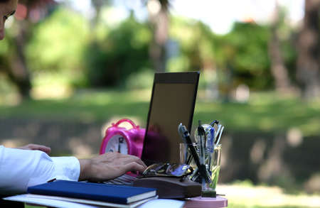 businessman working with mobile phone and laptop computer on wooden desk in the garden