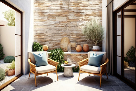 bright modern patio with stone surface and comfortable armchairs, created with generative ai