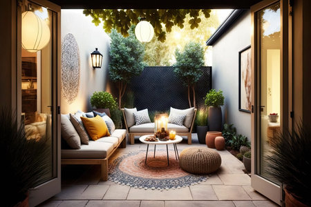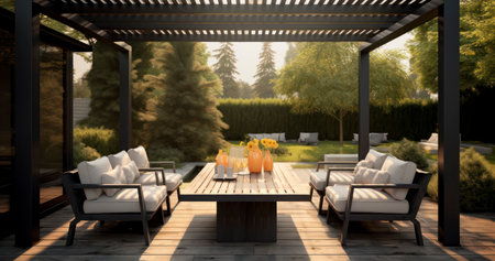 bright modern patio with comfortable furnishing and outdoor lighting, created with generative ai
