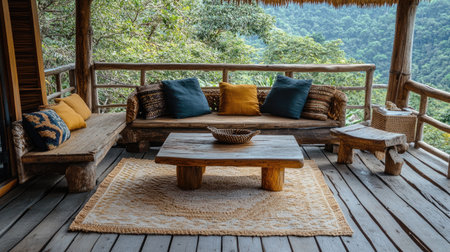 This image captures a serene outdoor porch scene, featuring rustic wooden furniture, vibrant greenery, and warm sunlight filtering through, inviting relaxation.