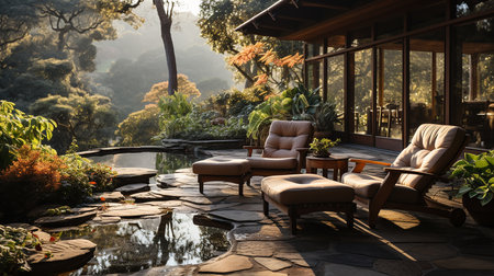 AIOutdoor nature exterior home house hotel architecture garden with cozy sofMany plants and flowers at sunset Graphic