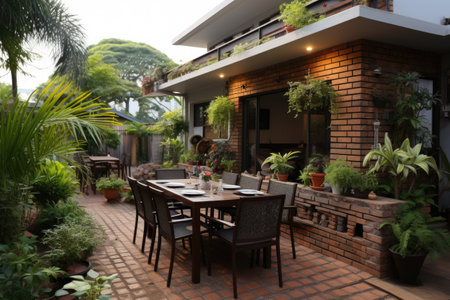 A patio with a wooden table and benches. Generative AI image.