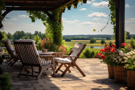 3d rendering of a country house garden terrace with a garden furniture