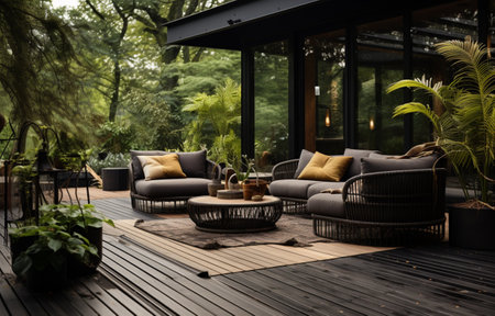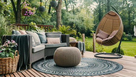 Luxurious rattan outdoor furniture set on wooden deck in sunlit garden conceptual design