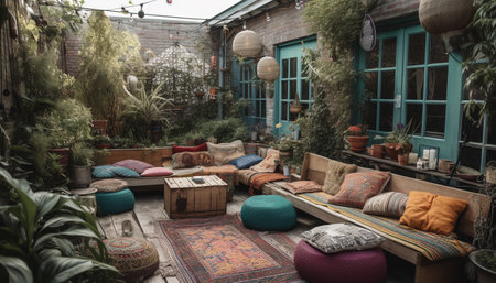 outdoor lounge area, with plush cushions and throw pillows, surrounded by greenery, created with generative ai