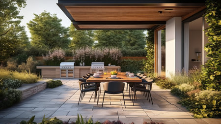 Contemporary patio with kitchen area. Generative AI