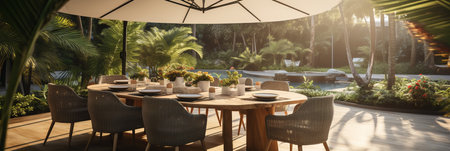 Outdoor patio in the garden with table and chairs, panorama