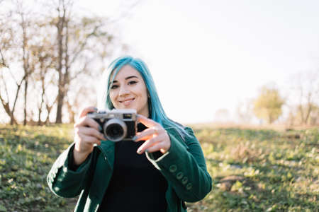 Woman with camera outdoors. Girl takes pictures. Hobby, leisure or profession