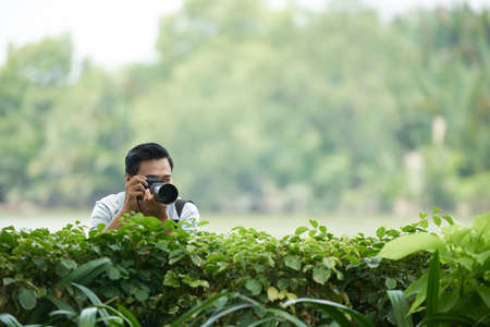 Photographer hipster man Hiking and tramping. Travel and adventure concept. Handsome guy taking photo on camera, in nature, outdoors. copy space. portrait