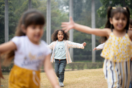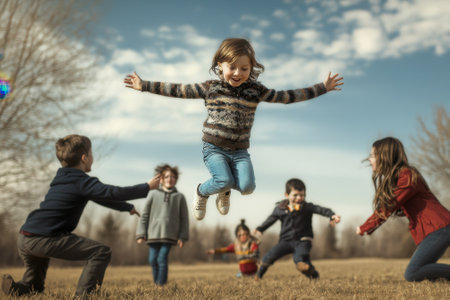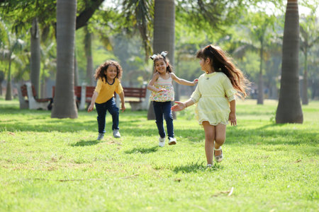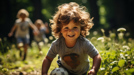 A group of children is captured in a playful outdoor scene, likely during daytime. The image showcases the children interacting in a natural environment. Sunlight bathes the scene, highlighting the green meadow. This image is suitable for various commercial uses, including advertising and editorial content.
