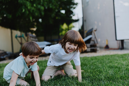 Happy children playing together on green grass, sharing laughter and joy, capturing the essence of childhood. Enjoy the vibrant summer vibes in this playful scene.