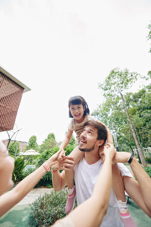 Happy young father giving piggyback ride to his little daughter when they are spending weekend in park
