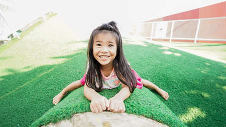 Adorable little asian girl playing on playground in the park.