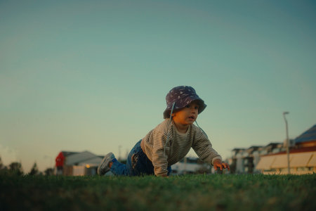 A young child crawls on the grass, showcasing curiosity and playfulness in a serene outdoor setting.
