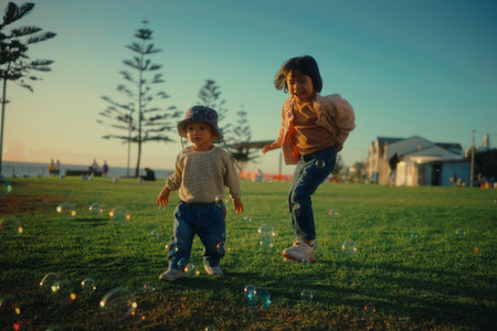Two children joyfully play with colorful bubbles in a park at sunset, surrounded by nature and pure fun