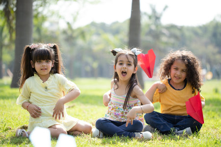 Group of children playing with paper airplane on the grass in the park