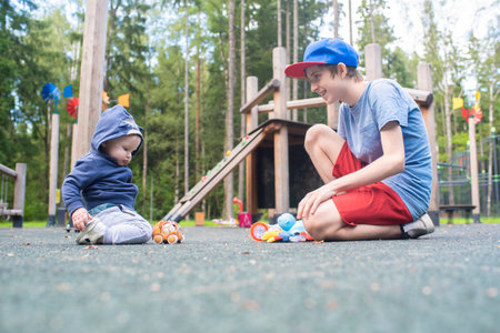 baby boy and his teenage brother playing on playground with toys in summer in park. children 12 years and 7 months