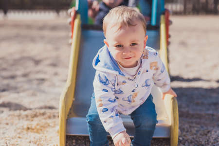 Adorable little 1-2 year old toddler boy having fun on playground in Krakow, Poland