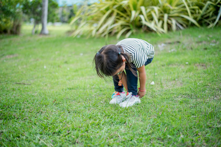 Asian girl bends down to put on shoes by herself in the backyard while doing mom and dad family vacation activities.