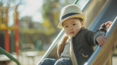 Cute asian baby boy playing on playground in sunny day.