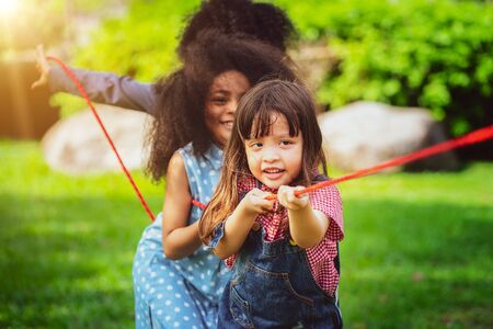 Happy children playing tug of war and having fun during summer camping in the park. Children recreation concept.