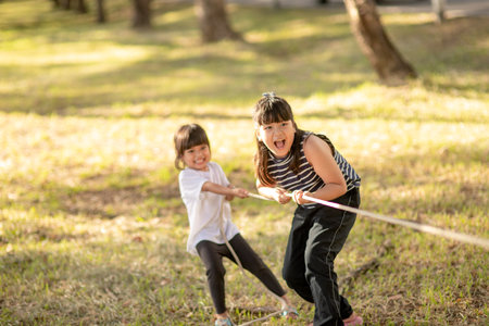 Girl children playing tug of war at the park