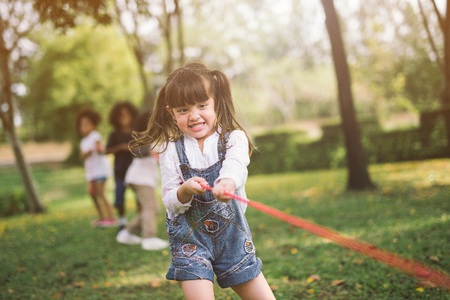 Children playing tug of war at the park on sunsut