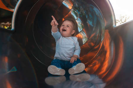 Happy caucasian baby girl playing on the playground, siting in tube. Outdoors. Happy Children's Day.
