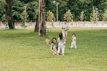 A family of two children, parents, and a dog in a park doing activities on the grass.