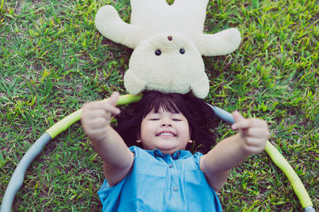 Portrait of asia happy little cute girl smiling and looking at camera in the park