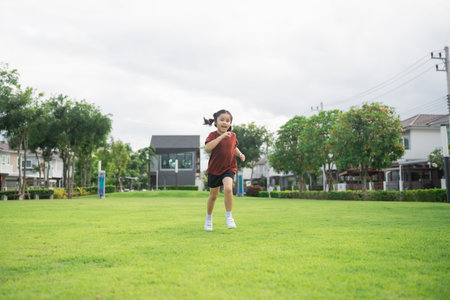 Joyful girl running in a green park during daytime, enjoying outdoor activity and vitality among trees and modern homes in the background