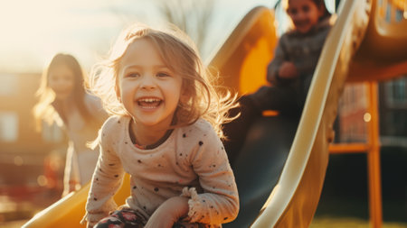 Cheerful young children playing on a playground. Concept of friendship, childhood joy, outdoor play, summertime, fun in the sun.