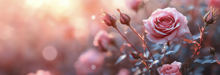 panoramic banner. beautiful delicate rose branch, pink flowers in summer garden with copy space.