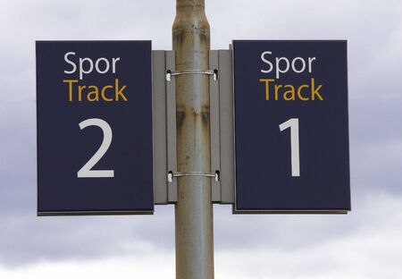 Mooring pier signs in city embankment, identification signs with MOORING inscription for arriving tourist ships. Mooring signs on street post for docked ships, blue sky background