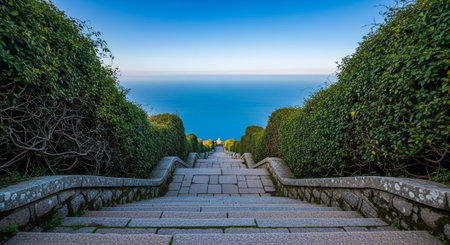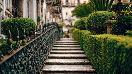 A picturesque garden pathway leads visitors through lush greenery, featuring ornate railings and charming stone steps, perfect for tranquil outdoor escapes.