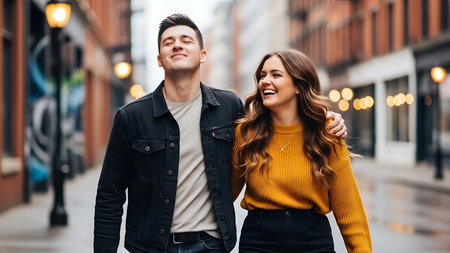 Portrait of a happy young couple walking on the street in the city