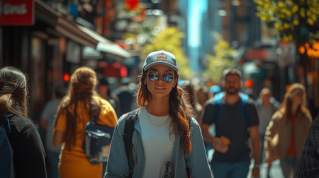 A woman with glasses smiling in a crowded street. AI.