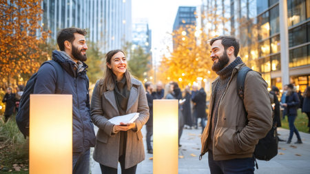 Three friends are seen talking and smiling in a city park, surrounded by modern buildings.